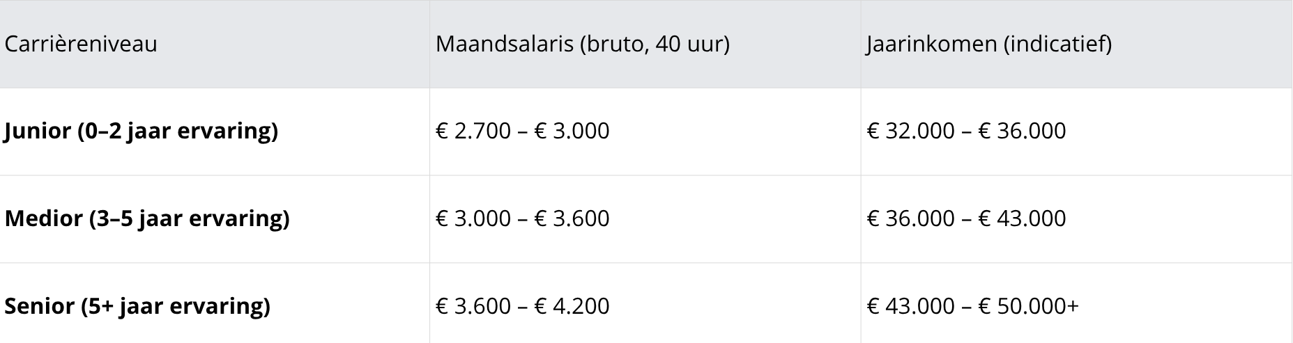 Naast salaris zijn er vaak aantrekkelijke secundaire arbeidsvoorwaarden, zoals: vakantiegeld, extra verlofdagen, pensioenregeling, leaseauto of mobiliteitsbudget, opleidingsbudget voor o.a. de AA-opleiding, hybride werken en flexibele uren.